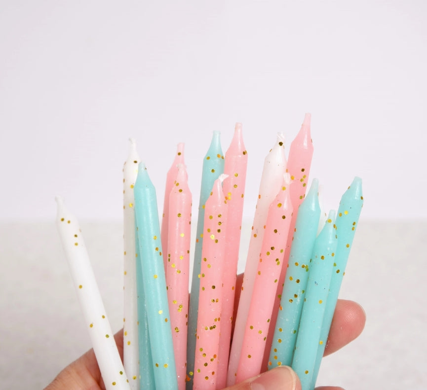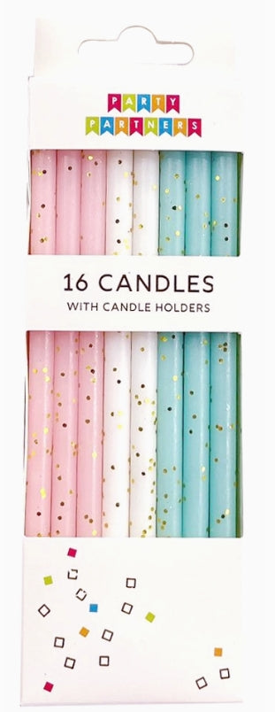 Pastel Gold Glitter 16 Candle per package w/ candle holders Size: 4.5” tall Make every celebration shine with our popular 16 Cake Candle Set! Each set includes 16 tall candles, standing at 4.5” for a bold, elegant look. These candles add a touch of luxury to any occasion. Complete with white candle holders for secure and easy placement, these candles are perfect for decorating cakes, cupcakes, and desserts. Ideal for birthdays, anniversaries, and any festive occasion, they’ll light up the moment with style and flair.