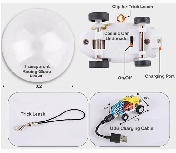 Our high speed Cosmic Car has an LED flashing light and long play time. Place it inside the Cosmic Racing Dome to watch as it spins 360° inside the dome. Hook up the trick leash and watch it spin. It will spin inside any round object. Buy 2 Cosmic Cars to have a tug-of-war or two-car spin action. Car recharges quickly with the included USB cable. Each Cosmic Car box comes with a colorful Cosmic Car, clear racing dome, trick leash & USB charging cable.