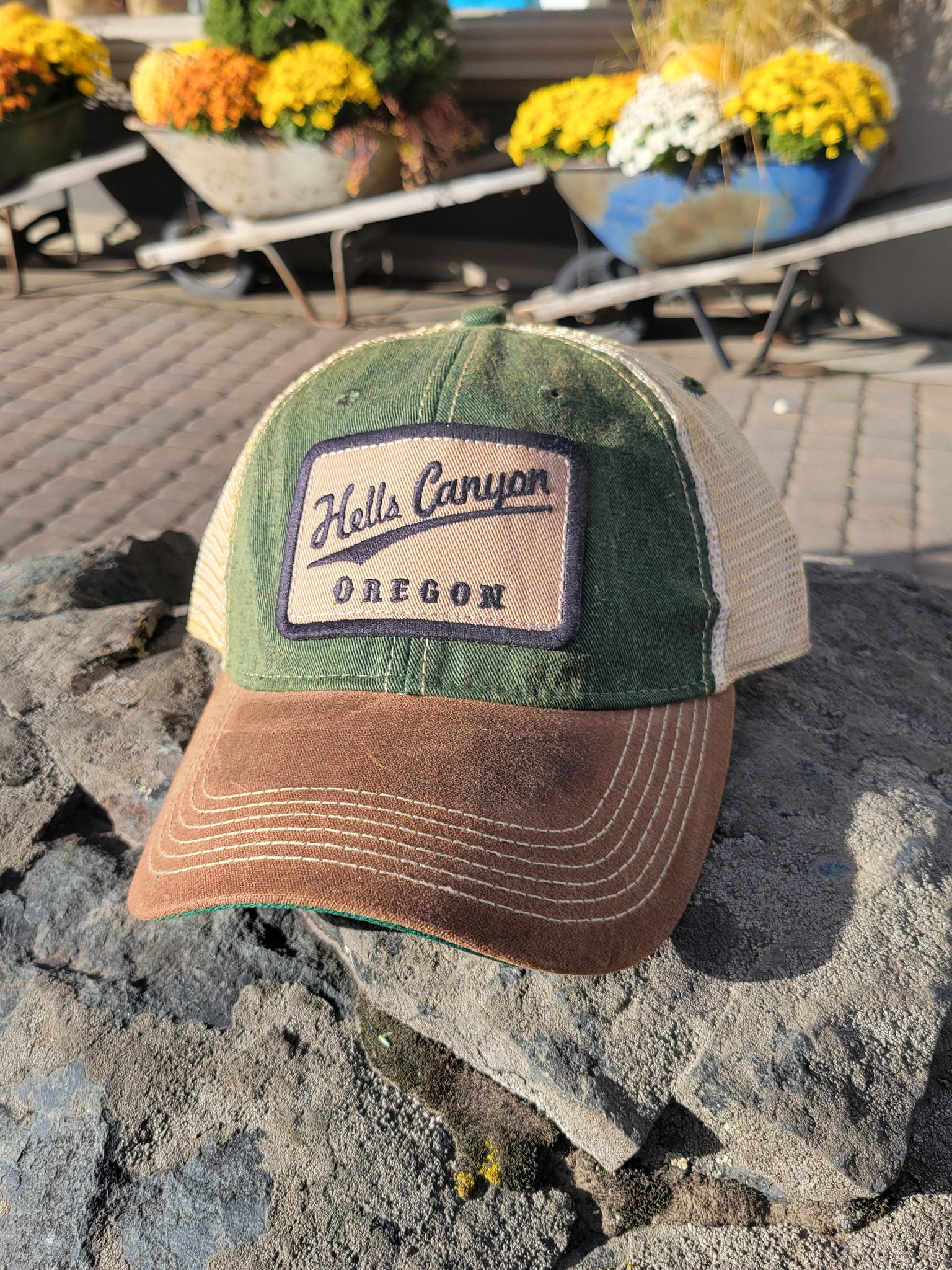 This Hells Canyon, Oregon ball cap blends everyday style with a nod to the great outdoors. It features a green front panel and tan mesh back, paired with a soft brown bill for a casual, relaxed look. The embroidered patch on the front displays “Hells Canyon” in script above “Oregon” in bold block letters, framed by clean stitching that adds a polished touch.