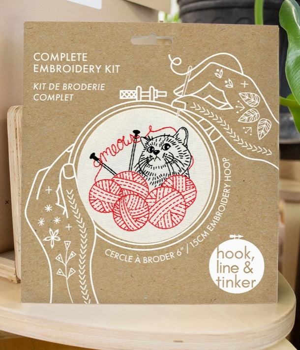 Craft kit includes: pre-printed pattern on unbleached cotton fabric 15cm (6”) embroidery hoop embroidery floss (2 full skeins) BOHIN size 3 embroidery needle instructions in ENGLISH and FRENCH. First time beginner friendly.