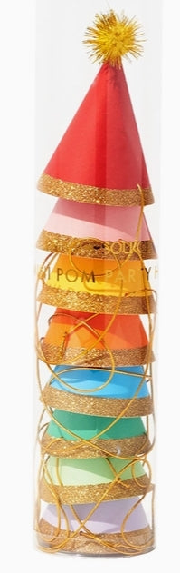 Set/8. Get in the spirit with these festive and adorable mini party hats! Each hat is 3" tall and lined with glitter, topped with a gold pom pom. They're the perfect party accessory whether you're wearing them, setting them on the table space, or giving them as favors! - Each hat measures 3.5" tall with gold glitter detail and a pom on top - This multi color pack measures 12" high in packaging.