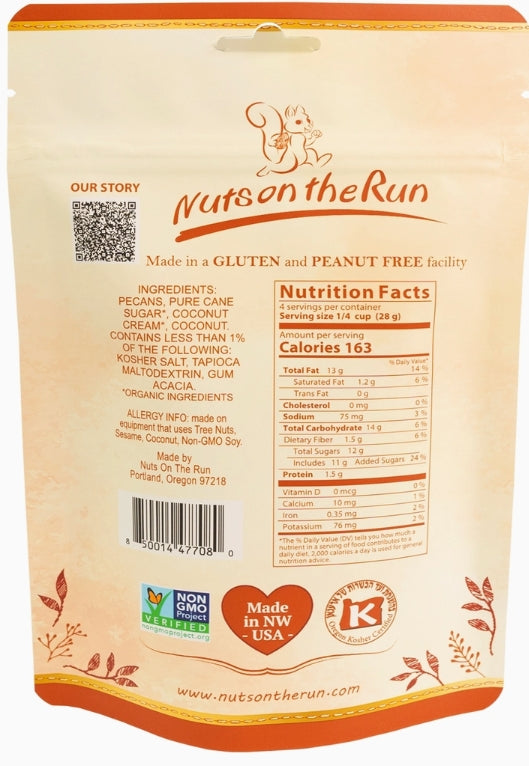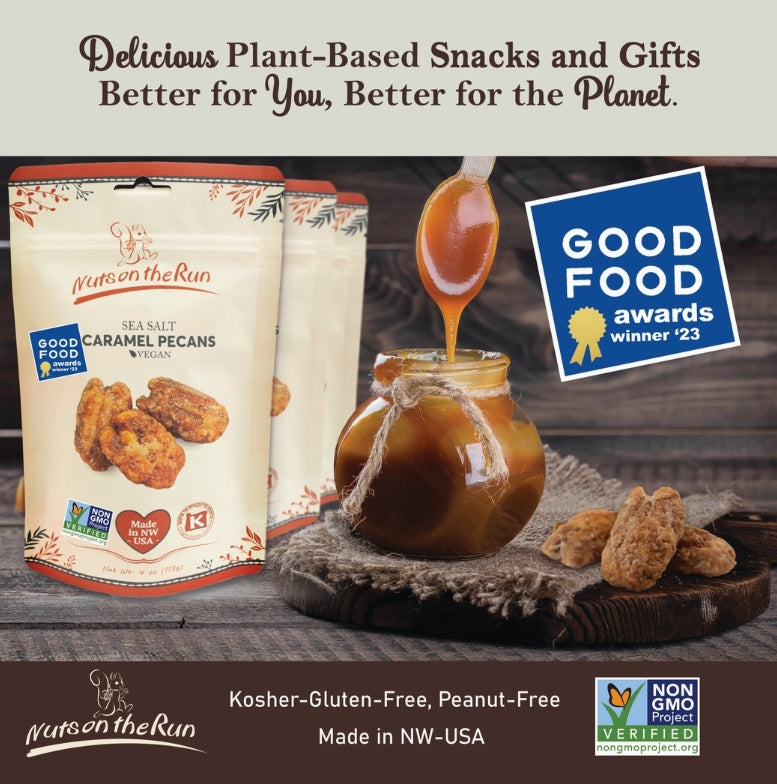Nuts on the Run's Sea Salt Caramel pecan is a 2023 Good Food Award winner for taste, Texture and great ingredients! Made with a rich caramel blend that consists of organic coconut cream and organic cane sugar, pecans, and a dash of flaky sea salt. Roasted over low heat in small batches to ensure freshness and crafted with the utmost respect to quality ingredients, our nuts are as fresh and tasty as can be!