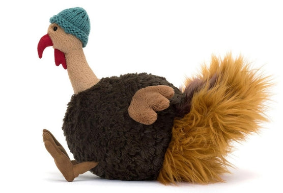 Theo Turkey may have plumage, but this turkey's taking no chances. He's knitted himself a bold teal hat, ready for the winter! Theo has over-sized honey feet, a round cocoa tummy and a silky ginger tail. Most impressive of all, this proud turkey has a beautiful suedette caruncle (that's the wobbly bit under his beak). A dazzling gift for happy holidays.